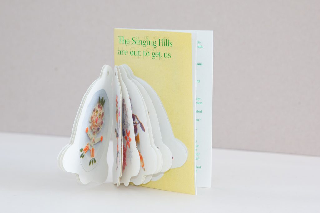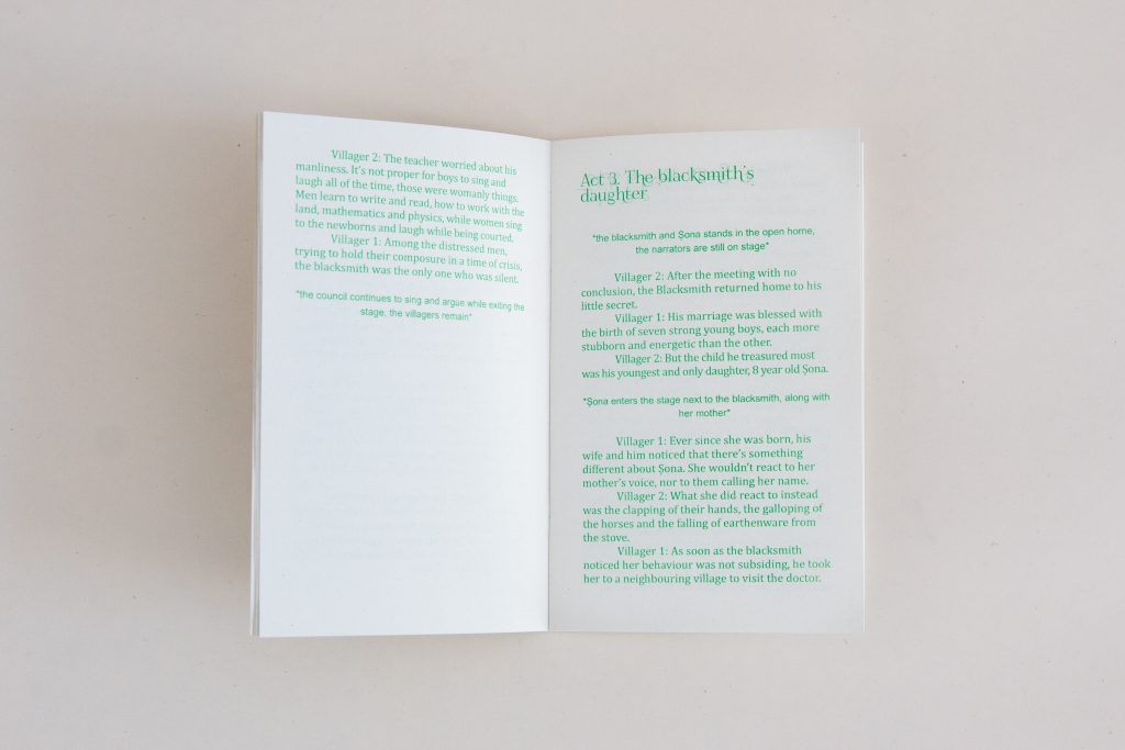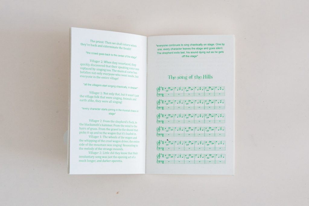 Just in time for the inauguration of the new communal stage of Șona, a cassette containing the recording of the classic play that will open the space was anonymously donated to the local radio station by one of the villagers. ‘The singing hills are out to get us!‘, a sci-fi musical play that explores the ‘true‘ horrors and origins of the strange mounds guarding the village from above, dubbed ‘guruiețe‘ by the locals. Collecting interviews, conspiracies and scientific theories, the project follows how their legend got distorted through time, and how the locals remember the guruiețe’s origin, all of them posessing a small fraction of their ‘actual‘ mysterious arrival, next to the village. (Lucian Barbu)