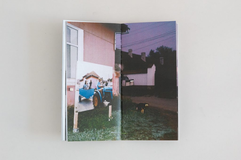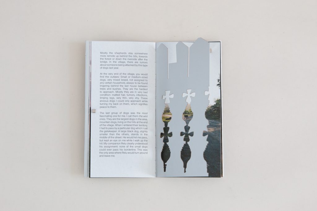 ‘Wooden stick‘ is a handmade book that revisits the idea of the photo album, bringing attention to the carriers of wooden sticks in the village of Șona. Whether used as a tool handle, a walking stick, or a bush cutter, the stick also serves here as the book’s binding. Its charred appearance recalls the blackened facades of Șona’s barns, evoking the possible sound of the book: the crackle of fire. The low-tech sound recording is the result of rubbing a contact mic that I deliberately dragged across the ground. The idea is to reproduce the gesture of the shepherd who crosses the village every day with a tree branch in hand, its foliage brushing against the asphalt. (Laure Caturgier)